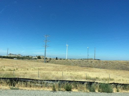 Heather lined highway, peppered with sage colored brambles and bushes, blonde dirt, sticks, twigs and tumbleweeds every where halved by the steel girded dividing rails. C.R. England semi sidling by. Slower traffic to the right. We travel the passing line a bit just like the other California drivers. Except we know better. They probably do too. Some of them–with impunity.