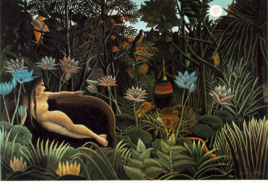 I once searched for a Rousseau painting with trumpet paths when I realized she referenced the painter not the philosopher/author. I had never seen nor recalled seeing a Rousseau painting and the internet was not at my disposal then. The Hissing of Summer Lawns album came out in 1975. I checked books and found Rousseau’s work, which I found pleasing, colorful and fun. The man appeared to have a sense of humor, squeezed joy from days. Unfortunately, I broke the limited art world I knew then at the ripe old age of 16 as serious and unserious art, Rousseau deemed too childlike to be serious.